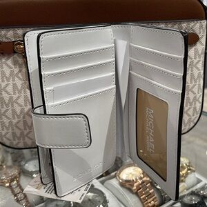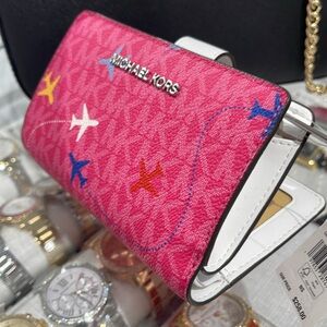 Stylish Michael Kors wallet in pink with multicolor accents. Features a bold logo design.