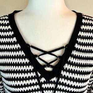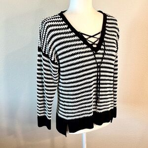 This White House Black Market WHBM sweater in size medium features a black and white striped pattern with a V neckline and 3/4 sleeves. The open knit, oversized style with stretchy material makes it very comfortable. The neckline features a lace up design which gives it a nautical feel. Pullover style. Excellent condition.