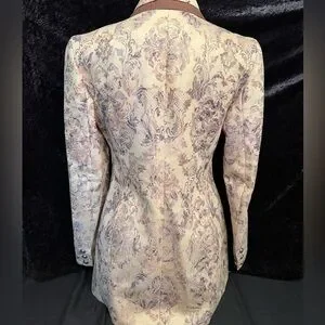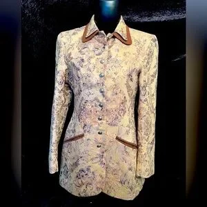 Make a statement with this stunning vintage Gina Blanez jacket, featuring an equestrian-inspired silhouette and a baroque tapestry-style brocade fabric.