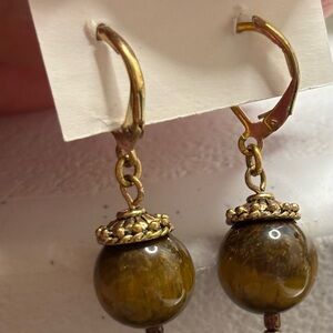 These elegant earrings feature a stunning combination of gold and brown tones, perfect for adding a touch of sophistication to any outfit. So pretty and shiny, these Tiger Eye ball dangles shine like they’ve been polished. They are gold tone with lever backs. Good condition! Genuine stones!