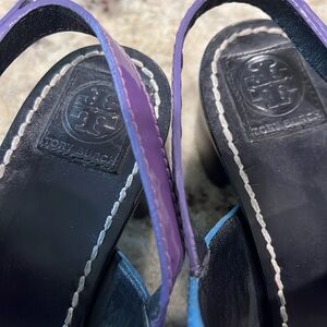 Tory Burch blue jeweled canvas vamp with mauve purple strap. Leather sole, 2” heel.