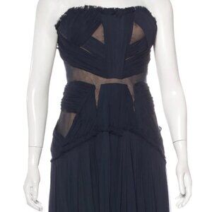 Description: Navy J. Mendel silk strapless gown with pleats throughout, ruched accent at bust, nude underlay, raw-edge trim and concealed zip featuring hook-and-eye closures at back.