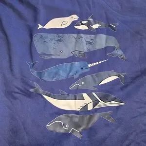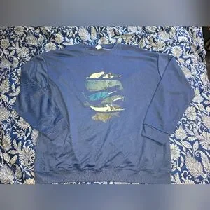 Dive into comfort with this stylish blue sweatshirt featuring a unique whale graphic. Perfect for casual outings. Due to my weight loss, I was never able to wear. 100% polyester. Smoke free home.