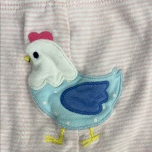 Cute set of 5 baby pants. Two have ruffles on the bottom and one has a chicken on the bottom. Various Brands. Size 6-9M