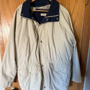 Like new! Stay stylish and comfortable with the London Fog Men's Jacket. Featuring a classic beige and navy design, this jacket is perfect for any occasion. Comes with detachable hood and detachable lining (included in pictures).