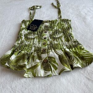 NWT Chaser Green Leaf Print Women's Top - Size Small. Embrace a beach vibe with this stylish green leaf print top. Adjustable tie straps with pleated bodice and ruffle hem line. Buttons are not faux. Perfect for casual outings, this top offers comfort and a chic look. Approximate measurements: