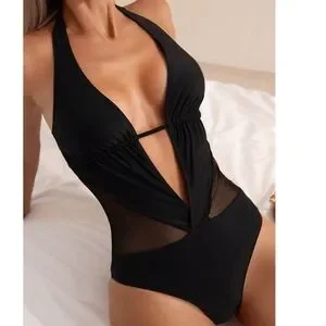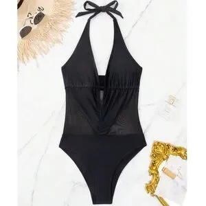 Teal Cut out Semi Sheer Halter Neck Monokini One Piece Swimsuit