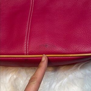 New with tags and never used. Chic color combination of vibrant pink with classic tan—perfect for everyday. New condition except this was unfortunately stored rubbing against other bags. There are several places (pictured) where leather is discolored. Leather wipes did not remove the stains.