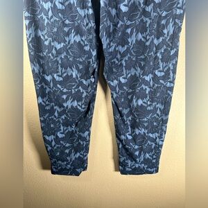 Stylish track pants with a blue floral pattern. Comfortable fit. Perfect for casual wear or workouts.