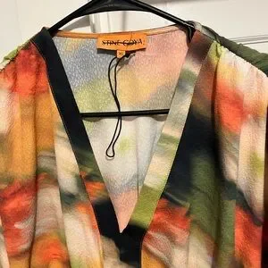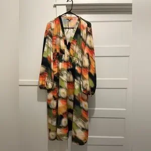 Stine Goya Veroma Floral Long Sleeve Midi Dress is a stylish and comfortable dress made of recycled polyester and polyester. The dress features a beautiful floral pattern, with long sleeves and a V-neckline. It has a pullover closure and is suitable for weddings, parties, and casual events. The dress is lined and has pockets for convenience. It is available in size XS and is suitable for summer, fall, and spring seasons. The dress is multicolored and has a flower theme. It is not vintage or handmade and cannot be personalized. The garment care includes dry cleaning only.