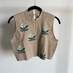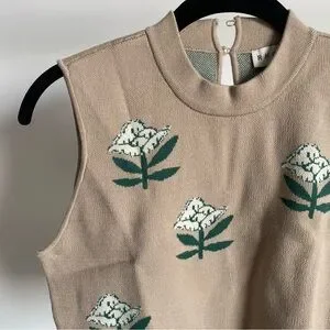 This RHODE knit top features a sleeveless design with a chic crop style. The neutral tan base is beautifully adorned with abstract green floral patterns, offering a fresh and nature-inspired look. Perfect for adding a touch of elegance to any casual ensemble. Pullover Style. Button Back Closure.