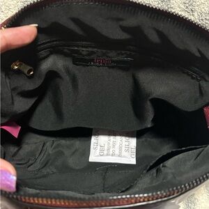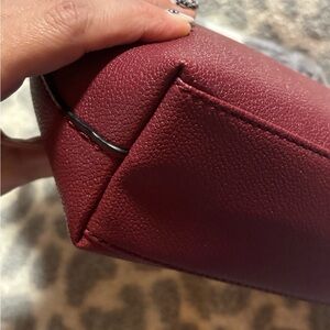 This bag is a nice ladies crossbody bag. It has a strap that goes over shoulder or body. The shade is a red wine .