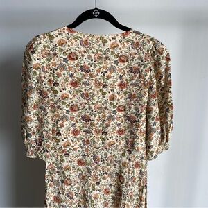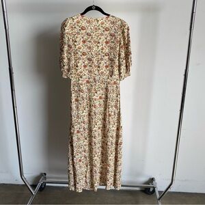 This RHODE dress is a stunning tan/beige midi with an all over floral design, perfect for a wedding guest or resort wear. The plunge neckline and short puff sleeves add a touch of elegance, while the light, airy fabric ensures comfort and style. Its versatile design makes it an ideal choice for both casual and formal occasions. Side Zip Closure.