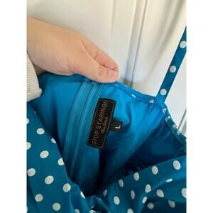 Stop Staring Ruched Sleeveless Retro Pinup Blue White Polka Dot Dress Large