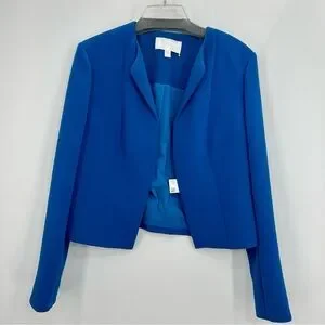 An open front with folded-back lapels streamlines the look of a fitted and cropped jacket, tailored from a vibrantly colored, textured stretch fabric.