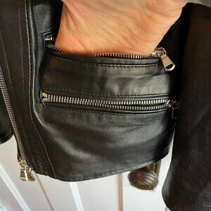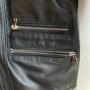 Moto zip jacket with exterior pockets (no inside pockets). All zippers fully functional. Black polyester lining. Zip is off-center/asymmetrical.