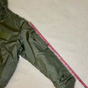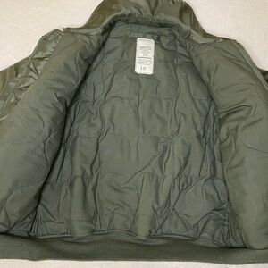 Cold Weather Flyers Jacket CWU-45/P in olive green. Large (42-44). DLA100-93-C-0399 MIL-J-83388. Zip closure. 2 front pockets with Velcro closure/1 arm pocket with zip closure. 100% Aromatic Polyamide. Dry Clean Only.