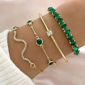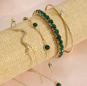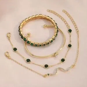 This stunning bracelet set features elegant green stones set in a luxurious gold finish. Perfect for adding a touch of sophistication to any outfit.