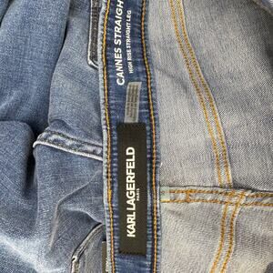 Karl Lagerfeld Paris women's above the ankle jeans. Blue in color. Medium denim wash. Tagged size 16. These designer jeans boast a logo tape waist band and some factory fashion distressing, These above the ankle jeans also feature a raw hem for a preppy boho look.