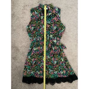 New York & Company Women Dress M Black Floral Tie-Neck Lace Hem Feminine