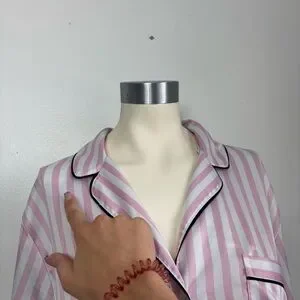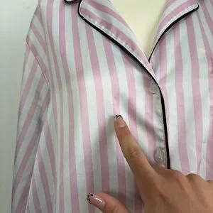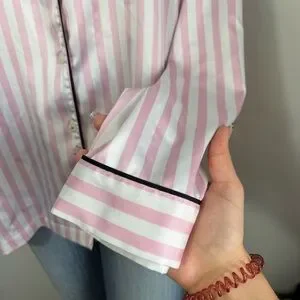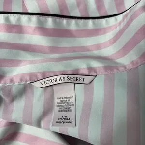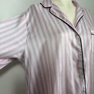 Victoria’s Secret satin stripe night top. In excellent condition. Has a couple small snags – pictured, not very noticeable. Pink and white stripes with black accent. Size large. Buttons all the way down.
