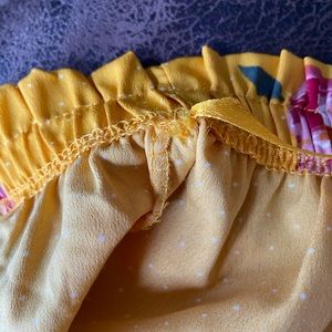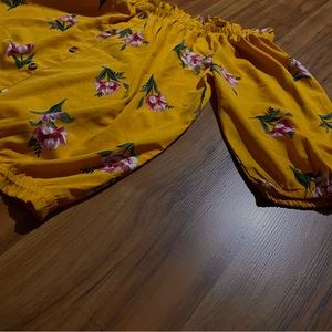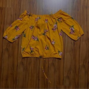 Mileage women’s off the shoulder floral crop top cinches at the waist size 3X pre-owned in good condition. 3/4 sleeves cinched at the end. Colors are yellow, pink, and green.