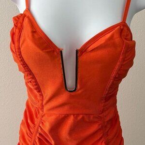 Features/Accents: Orange Color, Spaghetti Straps, Deep V-Neck, Satin/Silky, Stretch