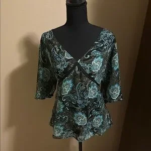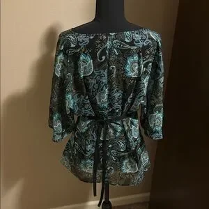 🌟This stylish Apt. 9 blouse features a tie in back design in a striking blue and black color scheme. The V-neckline and 3/4 sleeves add a touch of elegance, making it perfect for both casual and formal occasions. Its flowing fit ensures comfort and a flattering silhouette.