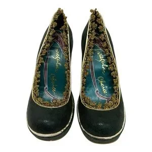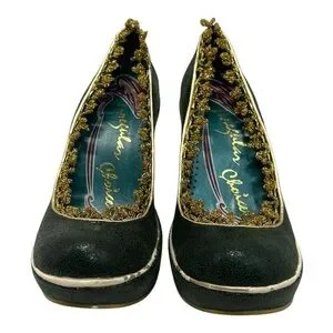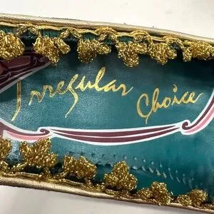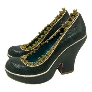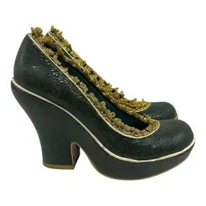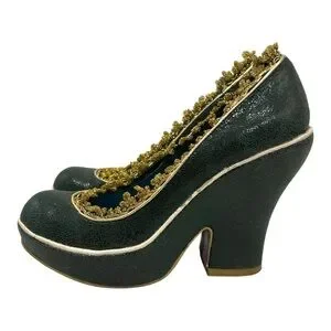 Irregular Choice Green Leather Gold Ricrac Slip On Platform Pumps Heels Women 38