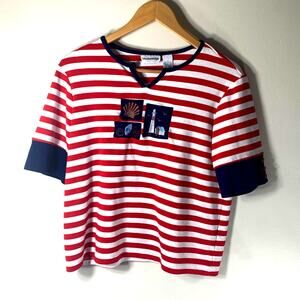 Nautical Red Striped Breckenridge V Neck T Shirt Navy Blue Trim Patches MEDIUM