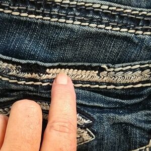 Very nice pre owned Silver Suki High Rise Boot Cut Jeans Size 25. Dark Wash with factory fading and whiskering. Some stitching missing on one of the back pockets, otherwise they appear to be in good condition. Measurements lying flat
