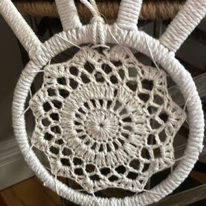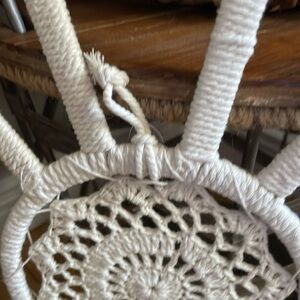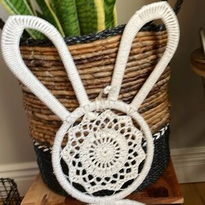 Charming cream crochet bunny wall hanging. Perfect for adding a whimsical touch to any room.