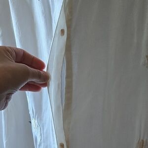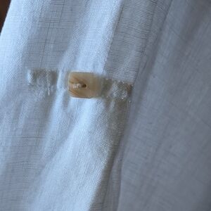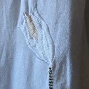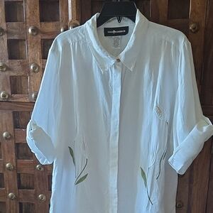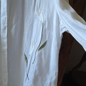 Elegant white blouse with floral embroidery. Perfect for a chic look. Spring to summer look. Beautiful tulip embroidery. 100% linen. Opening buttons, one button is missing. Long sleeve that can be adjusted to mid lenght sleeves. Pre-owned good condition. Measurements pit to pit 23.5", lenght shoulder down 24". (17)