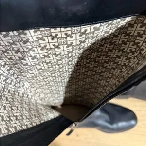 Elegant black leather riding boots with Tory Burch logo detail. Perfect for a stylish look.