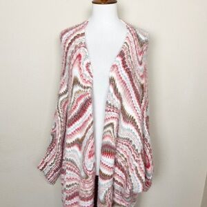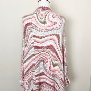 Layer up in this so soft eyelash knit cardigan featured in a cocoon style silhouette with a wavy, multicolored pattern.