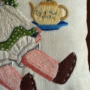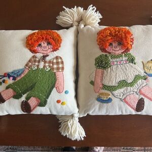 Charming embroidered pillows featuring doll designs. Vibrant orange hair and green outfits add a playful touch. Perfect for adding a vintage flair to any room. Tassel corners.