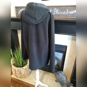Stylish black fleece zip-up hoodie with front pockets and a hood. Features a small logo on the pocket. Front pockets have a zipper.