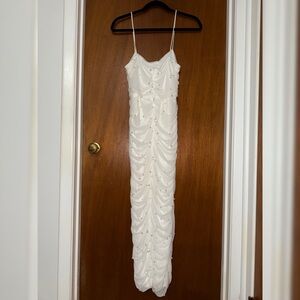 *Only worn once!* Lulus Toast to Romance White Ruched Pearl Bodycon Midi Dress. This elegant white ruched dress is perfect for any special occasion. Its sophisticated design and classic color make it a timeless addition to your wardrobe.