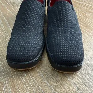 Stylish black dot mesh slide on pump loafer with unique block heel
