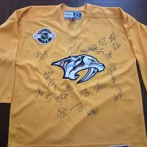 Ccm giveaway jersey Signed by some of the Nashville predators team.. not sure on the year or the players . has a couple stray marks from marker. Thanks for looking (bin 7)