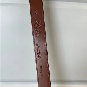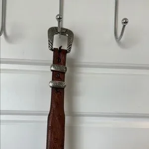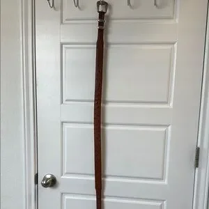 Stylish brown leather belt featuring an elegant silver buckle. Perfect for adding a touch of sophistication to any outfit.