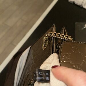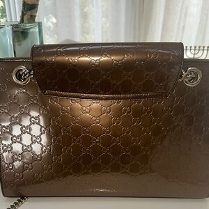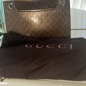This elegant Gucci shoulder bag features a rich brown hue and a structured design, perfect for adding a touch of sophistication to any ensemble. The luxurious textured finish and chain handles enhance its stylish appeal, making it a must-have accessory for any fashion-forward individual.