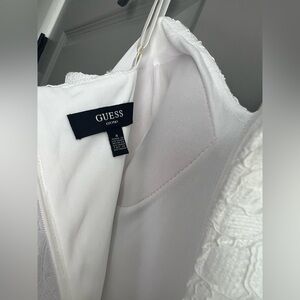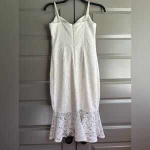 This elegant white lace dress is perfect for any occasion. Its delicate design offers a timeless look. Never worn!