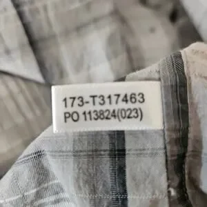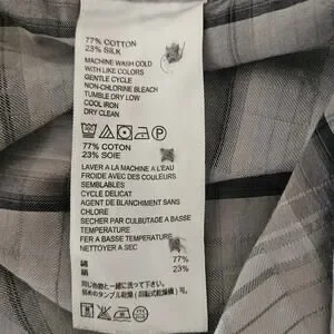 Description: Long sleeve, cotton silk blend button up men's shirt with a subtly faded plaid that creates a shadow effect on the shirt. Finished with a round shirttail hem and left chest pocket. Comes with replacement buttons. Recently dry cleaned.