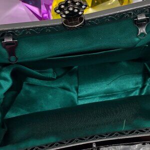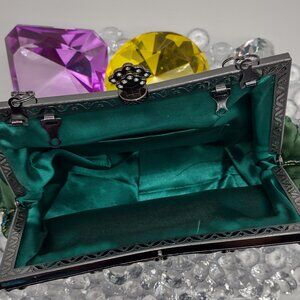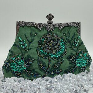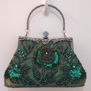NWT. Absolutely stunning vintage style floral embroidered clutch evening bag. Removable Strap, Buckle Closure, Polyester inner lining. Inner slide pocket. Dark green color, with baby pearls, and sequin embellishments. Style as clutch, handbag, shoulder bag or cross-body. Twenty two inch chain included. Measures 5.1”h x 9”w. A truly timeless look!