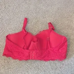 This stunning red bra features a textured lace design that covers the entire cup area, offering both elegance and support. The molded cups provide a flattering shape, while the adjustable straps ensure a perfect fit. Ideal for adding a touch of sophistication to your intimates collection.