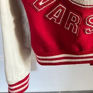 This jacket belonged to my daughter and she absolutely loved it! It has unfortunately become too small for her .... This is a rare TRUE RELIGION Hawks Varsity Jacket White leather sleeves White leather slit pockets Red and white wool outer Polyester lining Size is a SMALL to MEDIUM (the tag says Medium but it fits more like a SMALL) As NEW