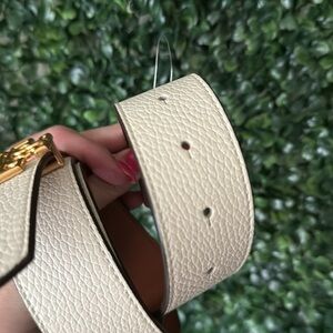 Upgrade your style with this elegant cream belt featuring a striking gold buckle. Perfect for adding a touch of sophistication to any outfit.