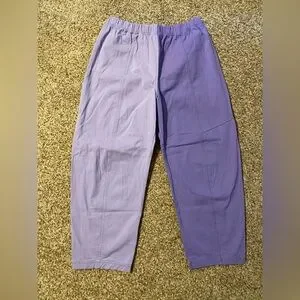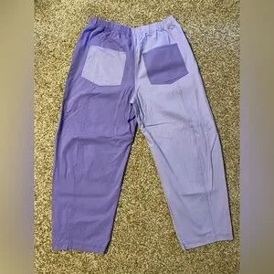 Verity & Daughters Janus Pants in red/pink. Contrasting rear pockets. This is the style without front or side seam pockets. Barrel leg silhouette. Elastic Waist.