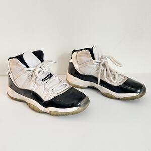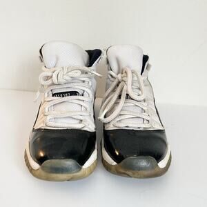 These iconic Nike Air Jordan Retro 11 Concord youth shoes feature a sleek black and white colorway. A must-have for sneaker enthusiasts, they blend classic style with comfortable cushioning. Perfect for making a statement on the court or the street. Signs of wear on shoes. Creases and light scuffs on shoes- see pictures for signs of wear.